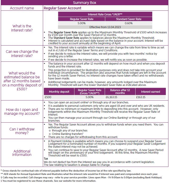 This summary box sets out key product features that apply to our Regular Saver Account. You should carefully read this document along with the Regular Saver Account Terms and Conditions to allow you make an informed decision as to whether this product is right for you.