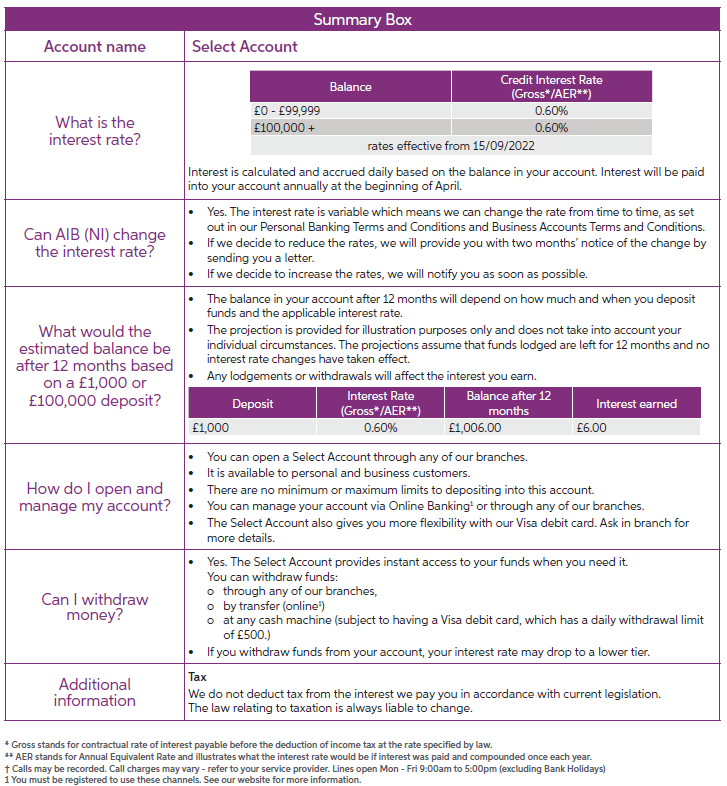 This summary box sets out key product features that apply to our Select Account product. You should carefully read this document along with the Personal Banking Terms and Conditions or Business Accounts Terms and Conditions to allow you make an informed decision as to whether this product is right for you.